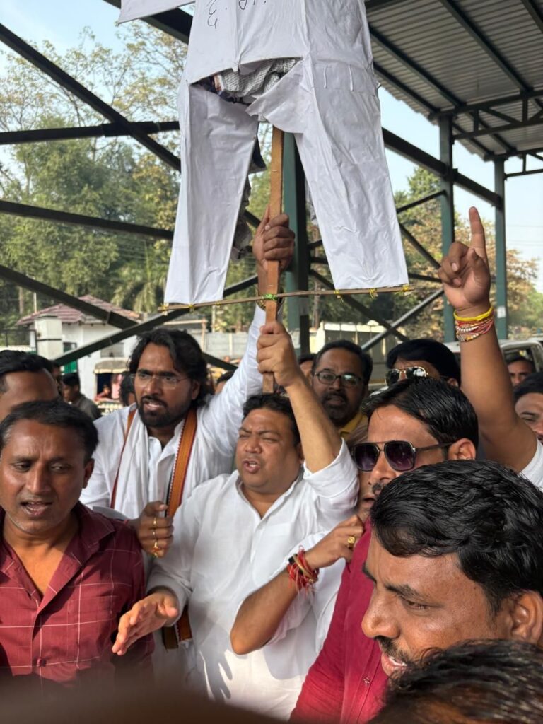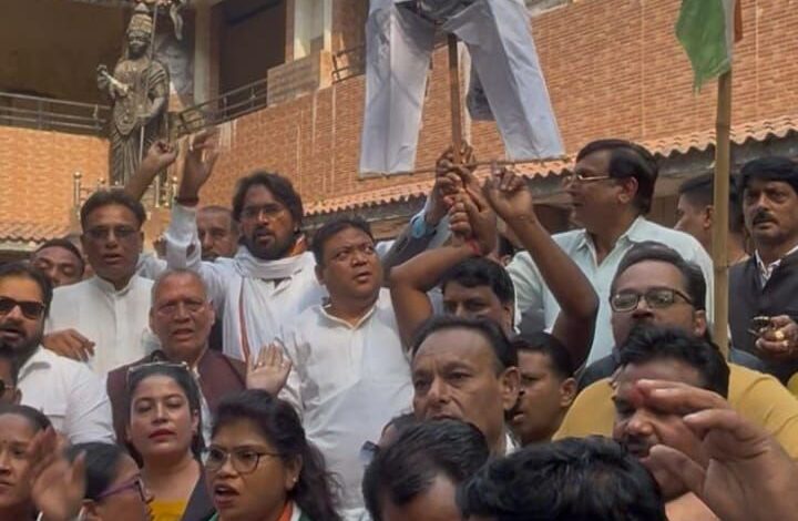 बिलासपुर । प्रदेश कांग्रेस कमेटी के आह्वान पर जिला कांग्रेस कमेटी (शहर/ग्रामीण) ने रविवार को नेहरू चौक में मुख्यमंत्री विष्णुदेव साय का पुतला दहन कर उग्र विरोध प्रदर्शन किया। इससे पहले कांग्रेसजन कांग्रेस भवन में एकत्र हुए और “मुख्यमंत्री मुर्दाबाद”, “रजिस्ट्री की नई गाइडलाइन वापस लो”, “5 डिसमिल जमीन की बिक्री बंदी खत्म करो” जैसे नारों के साथ जुलूस के रूप में नेहरू चौक पहुंचे। जुलूस के पीछे पुलिस बल भी तैनात था, लेकिन चौक पहुंचते ही प्रदर्शन अचानक उग्र हो गया। कार्यकर्ताओं ने पहले ही पुतले को आग लगा दी।